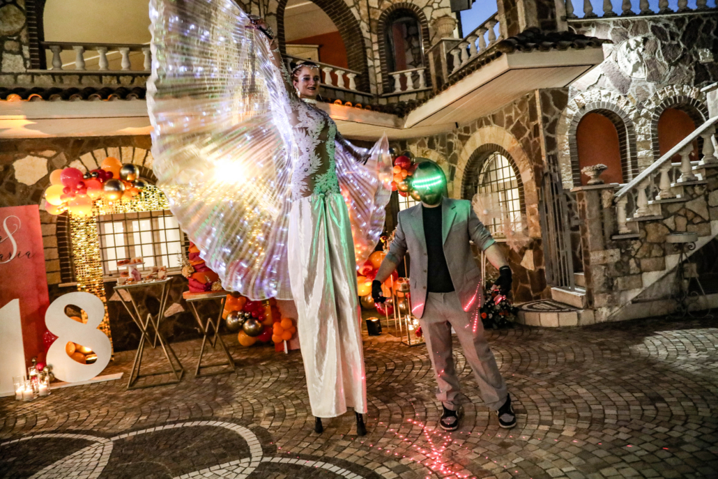 Eleganza in altezza e movimento danzano e dominano lo spazio con grazia, equilibrio e presenza scenica, trasformando ogni passo in un momento di pura meraviglia. Questo speccacolo può essere da costumi tematici e oggetti led/ fuoco su richiesta del committente. Inoltre, si propongono anche pacchetti per feste azziendali ed eventi privati con accoglienza ospiti.