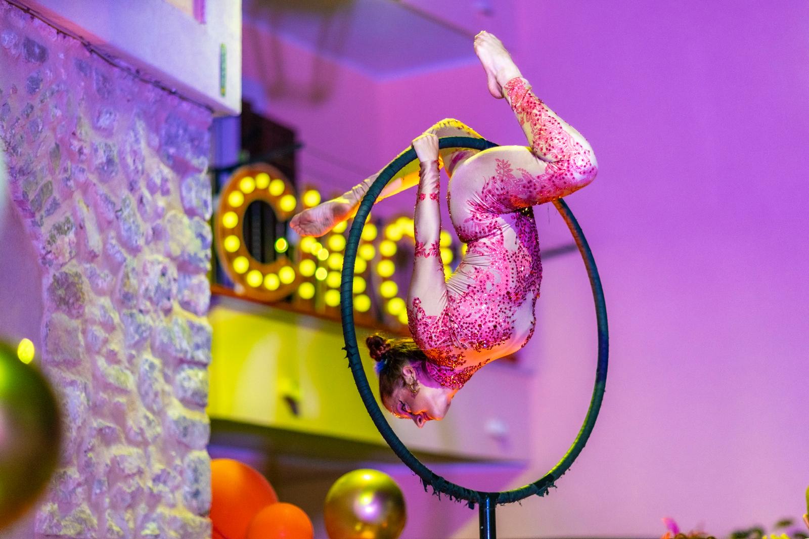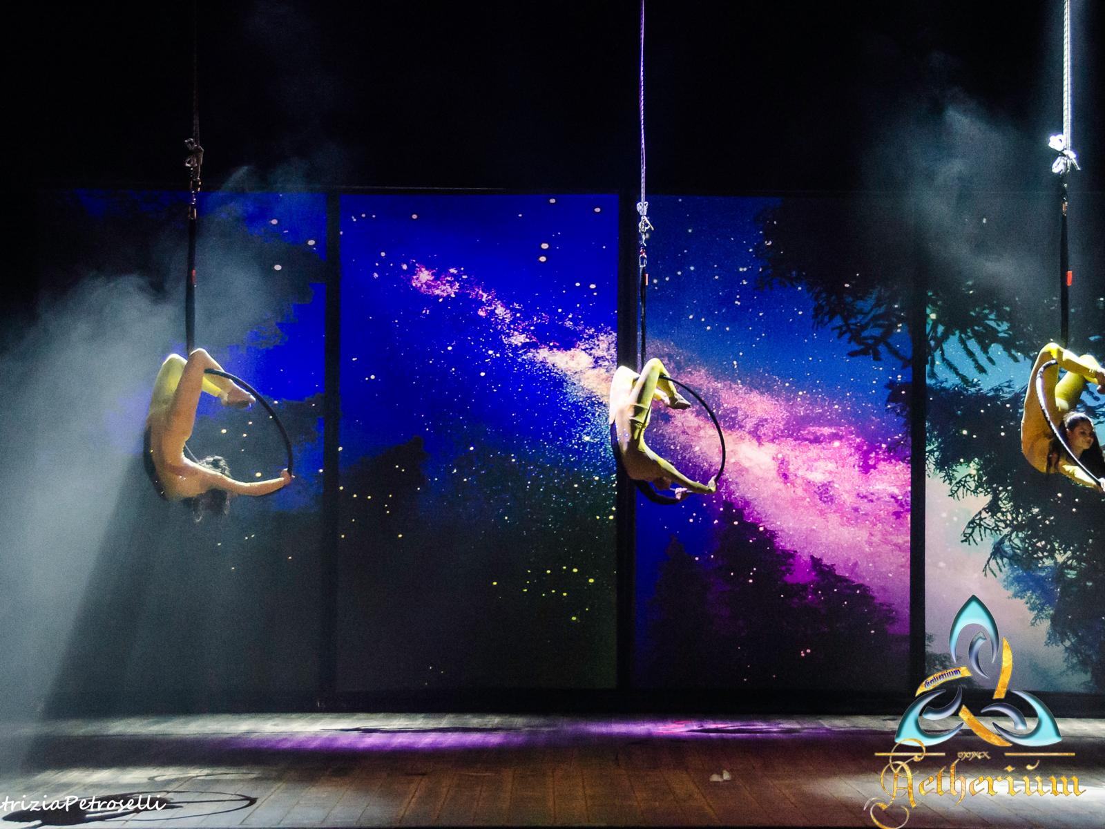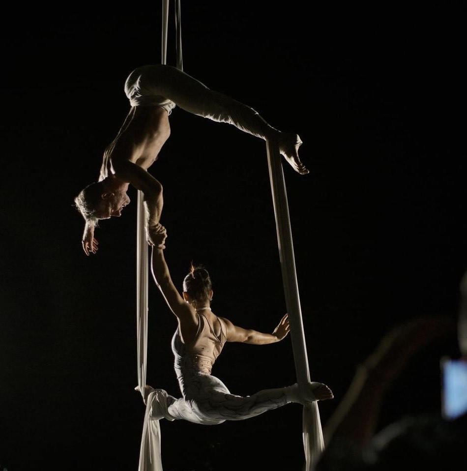 Eleganza sospesa tra cielo e terra, danzano avvolti nei veli, creando coreografie aeree che uniscono forza, grazia e poesia visiva sfidando la gravità. Gli attrezzi utilizzati possono essere: lollipop, tessuti aerei, corda, straps, cerchio e cornice.