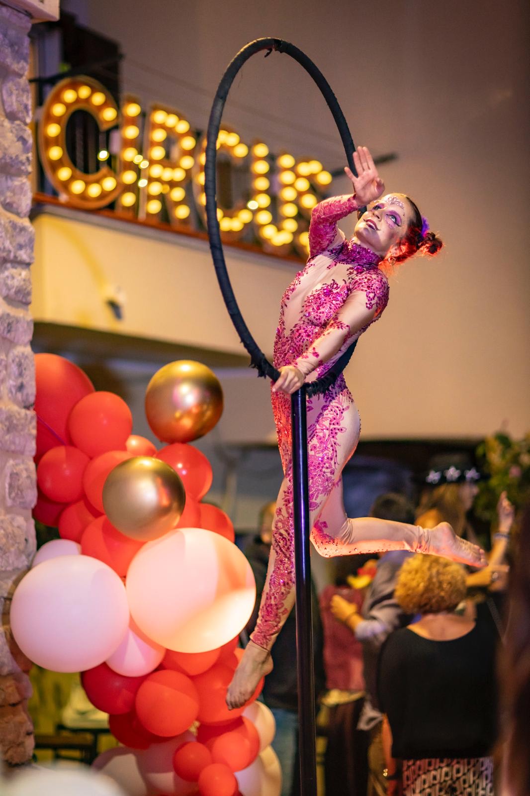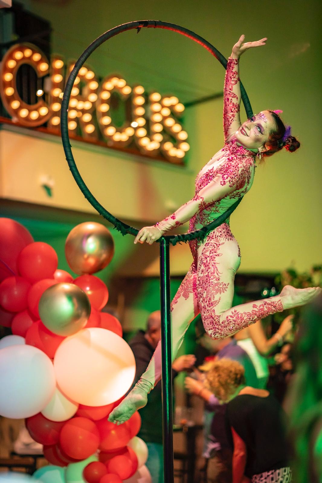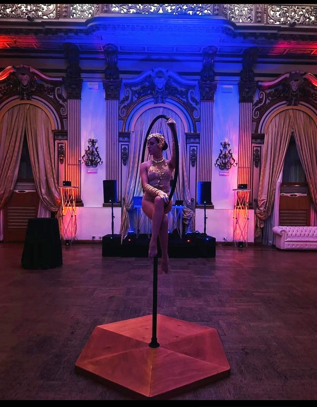 Eleganza sospesa tra cielo e terra, danzano avvolti nei veli, creando coreografie aeree che uniscono forza, grazia e poesia visiva sfidando la gravità. Gli attrezzi utilizzati possono essere: lollipop, tessuti aerei, corda, straps, cerchio e cornice.