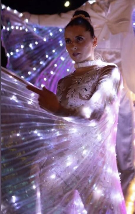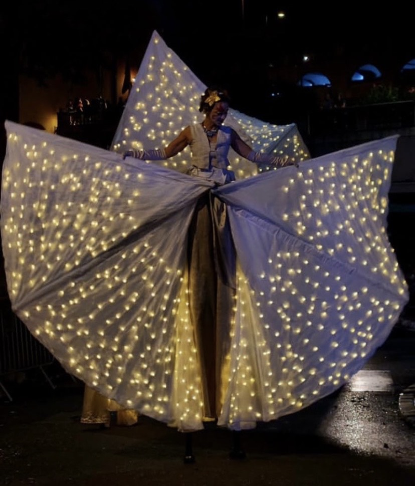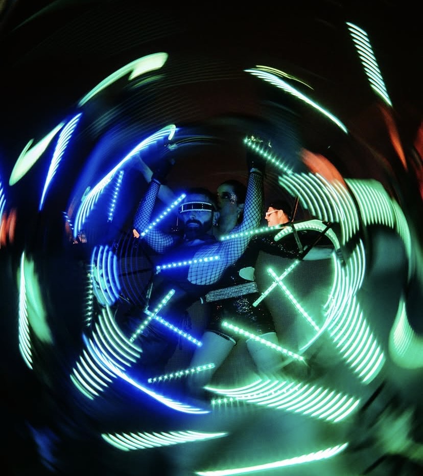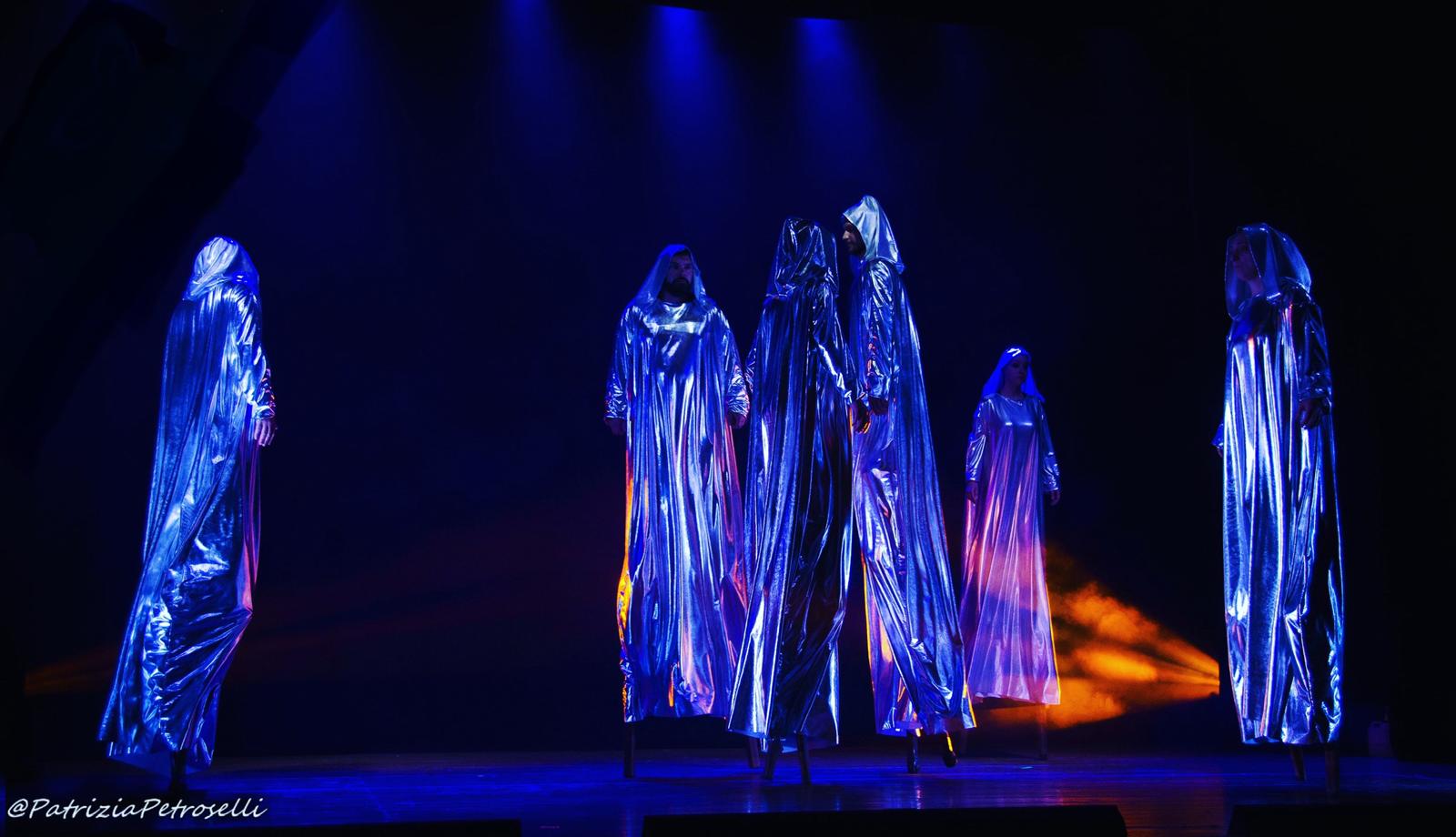 Luce, ritmo e movimento si fondono in uno spettacolo di pura energia visiva. Costumi e oggetti luminosi creano coreografie dinamiche e scenografiche su trampoli e a terra, dove la tecnologia diventa arte in movimento.