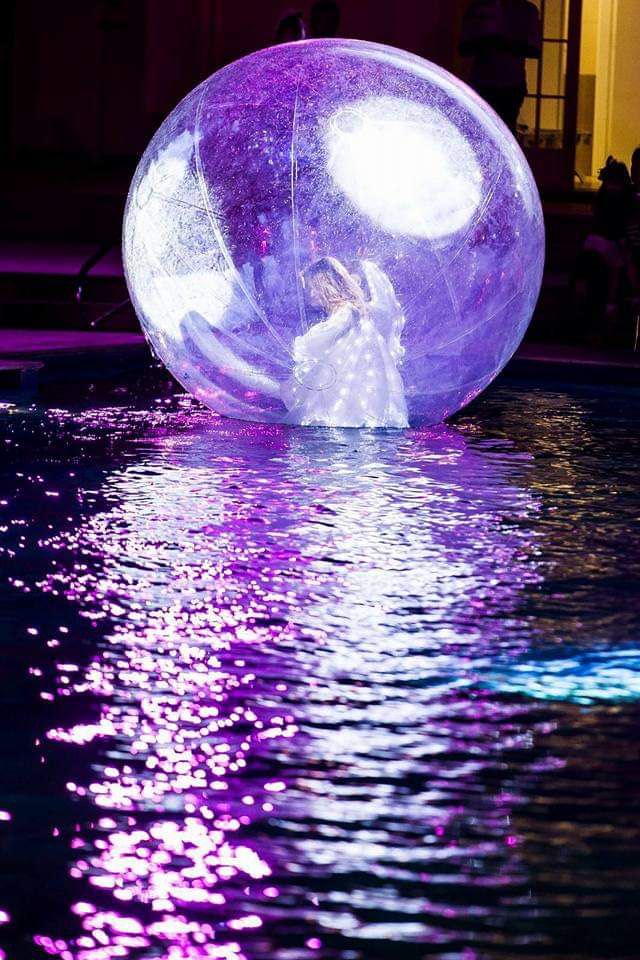 Leggerezza che galleggia sull’acqua. All’interno di una grande sfera trasparente, la performer danza tra riflessi e movimenti fluidi, trasformando la superficie della piscina in un palcoscenico di pura magia visiva. Un effetto scenico raffinato e poetico che incanta ogni sguardo. E’ possibile, effettuare la stessa perfomance anche su manto erboso e pavimentazione con uso di moquet.